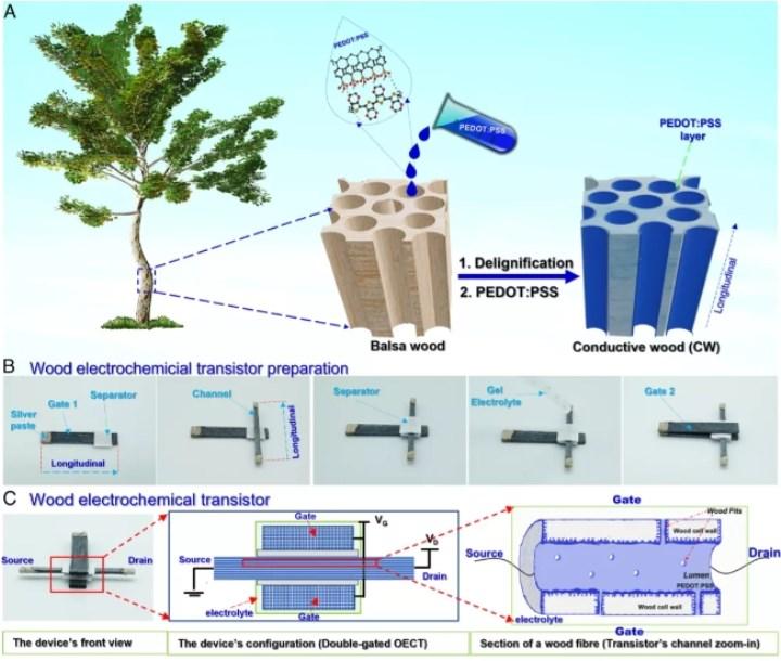 Ahşap ve gümüşü birleştiren evvelki bir denemede iyonik iletime dayanan bir transistör üretildi ama iyonlar bittiğinde transistör de ömrünün sonuna geliyor. Öte yandan yapılan yeni keşifte ise transistör daima olarak çalışabiliyor. Bunun için araştırmacılar balsa ağacının damarsız ve düzgün yapısını tercih etti. Elbette elde edilen ahşapta bazı modifikasyonlar gerçekleştirildi: Araştırmacılar ahşaptan lignini çıkardılar ve geriye yalnızca ligninin olduğu yerde kanalları olan uzun selüloz lifleri bıraktılar. Bu kanallar daha sonra PEDOT:PSS ismi verilen iletken bir polimer ile doldurularak elektriksel olarak iletken bir ahşap materyal elde edildi. 1Hz suratında çalışıyor