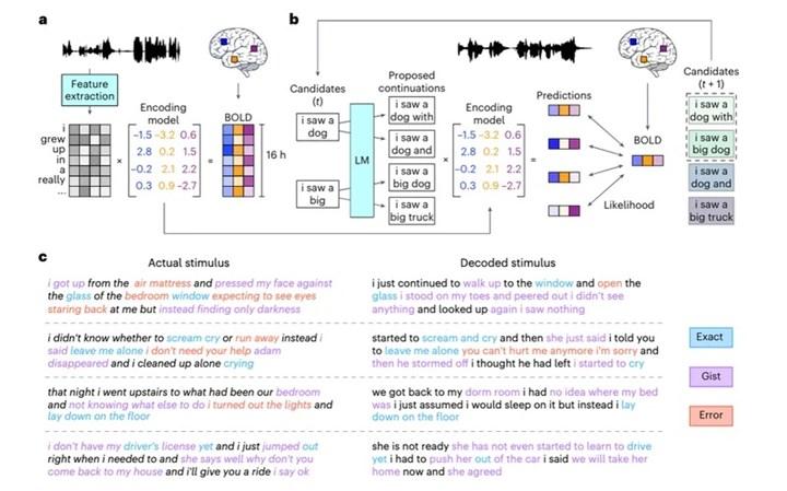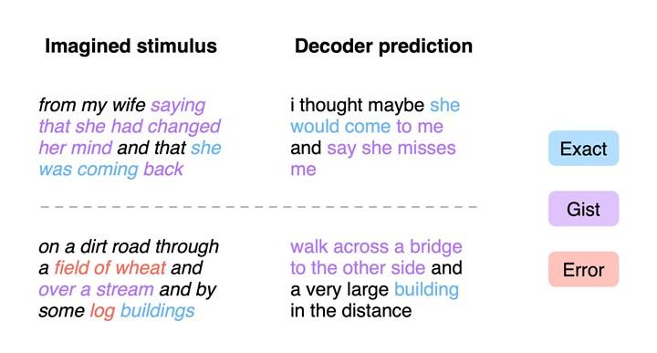 UT Austin Sinirbilim ve Bilgisayar Bilimleri Merkezi’nden Yardımcı Doçent Alexander Huth düzenlenen basın brifinginde “Sistemimiz çok farklı bir seviyede işliyor. Sistemimiz bu düşük düzeyli motor olayına bakmak yerine; sahiden fikirler, semantik ve mana seviyesinde çalışıyor. Ulaşmaya çalıştığımız şey bu.” Yapılan deneylerde GPT-1, işitsel ve görsel dataların yanında hayal ettikleri bilgilerle beslenen insanların fikirlerini yüksek oranda gerçek biçimde kestirim etti. - Algılanan konuşma (denekler bir kayıt dinledi): Yüzde 72-82 kod çözme doğruluğu