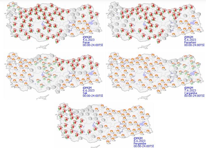 Meteoroloji Genel Müdürlüğü tarafından yapılan son değerlendirmelere nazaran: Ülkemiz genelinin modüllü ve çok bulutlu, Marmara’nın kuzey ve doğusu, İç Ege, Akdeniz, İç Anadolu, Batı ve Orta Karadeniz, Doğu Anadolu’nun kuzeydoğusu ile Giresun ve Artvin etraflarının aralıklı ve lokal sağanak ve gök gürültülü sağanak yağışlı geçeceği iddia ediliyor.