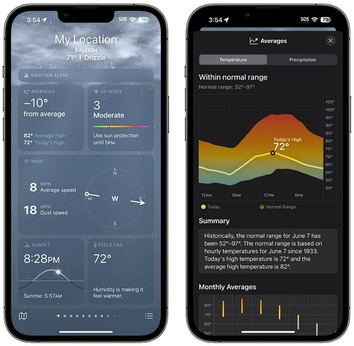 Bazı hava durumu modüllerinin yeri değiştirilmiş, yağmur ve saatlik tahminler önce gösterilmeye başlanmış. Haberler ve uyarılar uygulamada daha aşağıda gösteriliyor ve mevcut sıcaklığın o günkü tarihsel ortalamadan nasıl saptığını gösteren yeni bir “Ortalamalar” hava durumu modülü var.