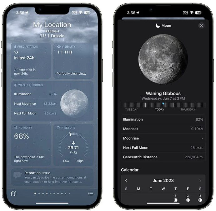 Apple, Ay’ın mevcut durumunu, bir sonraki dolunaya kadar geçecek süreyi, Ay’ın batış-doğuş saatlerini ve Ay takvimini gösteren bir Ay modülü ekledi. Ayrıca rüzgar hızı modülü, bir bakışta rüzgar hızı hakkında bilgi gösteren daha büyük bir boyuta sahip. Bunlara ek olarak UV endeksi, nem, hissedilen endeksi ve günlük karşılaştırmalar da dahil edildi. Kaynak: Donanimhaber