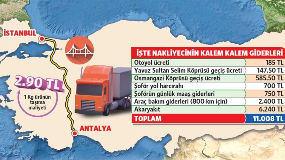 CHP Uşak eski Milletvekili Özkan Yalım’ın, nakliyecilerin yol masrafına ilişkin yaptığı hesaba göre, ürün halden bedavaya dahi alınsa sadece Antalya’dan İstanbul’a gelene kadar kilogram fiyatı 2.90 TL oldu. Tarladan çıkan bu ürünlere ayrıca ürün ücreti, komisyoncu ücreti, hal ücreti, KDV ve halden şehir içi nakliye ücreti, satıcı kârı gibi ücretler eklenince tezgaha ulaşana kadar fiyat katlanıyor.