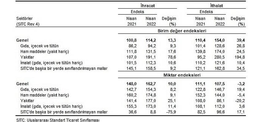 İhracat birim değer endeksi Nisan ayında bir önceki yılın aynı ayına göre 13,3 arttı.