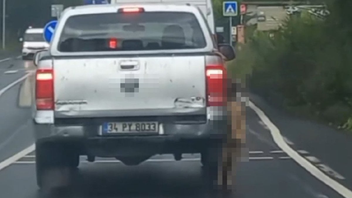 Sarıyer'de seyir halindeki pikabın gerisinde asılı biçimde görülen köpek manzaraları büyük reaksiyonlara neden oldu.